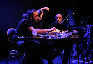 HLCollins starts his set in a rattling trio with Nicholas Langley and Hassni Malik from The Vitamin b12 sat in line at a metal baker's tray, scraping metal objects of various sizes about. Its theatre and oddly musical, and very funny. After a quick session with Henry up a set of steps banging a mic'd metal bin Nick and Hassni leave the stage and Henry moves onto a didgeridoo coffee machine that spits water but makes amazing sounds, he then moves onto a turntable and some balloons and effects for a comedy improv session that gets slowly creepier with a slurring hum playing back against clicks and bumps and occasional bird call for an ambient music for hell's ante-room.